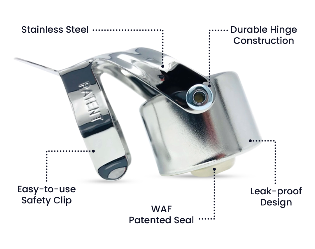The Kloveo uses a patented WAF seal based on Pascal's Law. As pressure builds inside the bottle, the seal tightens, ensuring that your Champagne remains bubbly. This unique mechanism, combined with its ease of use and durable construction, sets it apart.